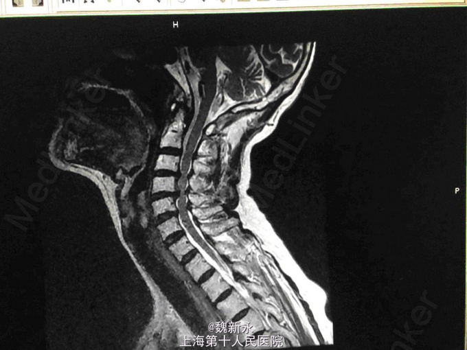 查体:患者精神可,胃纳差,睡眠差,气平,心肺(-),颈部活动僵硬,颈部压痛不明显,双手感觉减退,右侧更重。双侧肱二头肌肌力Ⅴ级,双侧桡侧腕伸肌肌力Ⅳ级,双手握力减退,双侧肱二头肌反射+++,桡骨膜反射+++,双侧肱三头肌反射++,双侧Hoffmen征+,双侧踝阵挛+,双侧Babinski征-,双下肢股四头肌/拇长伸肌/拇长屈肌肌力Ⅳ级,双下肢膝反射/踝反射亢进。 辅检:MRI:颈4-5、颈5-6、颈6-7椎间盘突出,脊髓局部受压,颈椎退变。