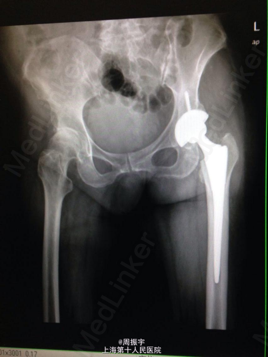 查体:患者发病以来精神可,胃纳差,睡眠差,大小便正常,体重无明显减轻。 左下肢短缩外旋畸形,左髋未见红肿及皮肤破损。左髋压痛(+),左下肢纵向叩击痛(+),足背动脉搏动好。左髋活动明显受限,左膝活动无受限、左踝及足趾活动无异常,左足背动脉搏动好。左下肢较右下肢稍缩短约1cm。余肢体均正常。 辅查:X线:左股骨颈骨折。 骨盆正位数字化摄影 , 检查诊断:左侧人工髋关节置换术后。右髋关节退变,右股骨头坏死可能,请结合临床。