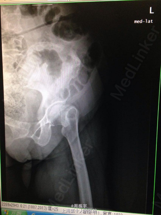 诊断:左股骨颈囊内骨折(Garden IV型) 治疗经过:患者入院后完善各项检查,明确诊断,积极术前准备,全麻下行左侧全髋关节置换术,术顺。