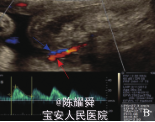 查体:一般情况可,心肺体查无明显异常,产科检查:宫高 32cm,腹围 98cm,胎心 140次/分。 孕35+2周B超:宫腔内探及一结构正常胎儿(泵血儿)及一不规则球形含骨性包块(无心畸胎儿) 。1个胎盘,两胎儿间见纤细光带分隔。无心畸胎儿固定于宫腔右下方,羊膜光带紧贴胎儿周边,大小为 9.3cm×7.0cm×5.1cm,无头、无心、无上肢,全身皮肤明显水肿,厚约 2.4cm, 内可见不规则骨性结构, 光团远端见一小肢体样结构(图1) ,腹部可见 1.5 cm 连续性中断,中断处可见 3.0 cm ×2.8 cm肿块向外膨出,内可见肠管回声。体内及脐血管内可见血流信号,脐动脉反向灌注朝向胎儿体内,脐动脉搏动指数1.06,阻力指数 0.67,收缩期 / 舒张期比值 3.0(图 2) 。