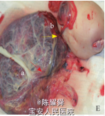 临床诊断:1、双胎反向动脉灌注序列征;2、宫内孕35+2周;3、孕1产0;4、双胎妊娠。 处理:孕妇孕 38 周剖宫产一结构正常女婴和一 无心畸胎儿,术后将无心及胎儿送检: 无心畸胎儿为一团状胎块,圆球形,大小为 14.0cm×11.0cm×6.5cm,有少许毛发,无头、无心,脐膨出 4.0 cm×5.4 cm×1.5cm,无上肢,下肢仅有一小脚掌,4 根脚趾 ;1个胎盘,双胎儿胎盘脐带插入处两者相距约 7 cm,两胎儿脐带表面有粗大的血管交通。