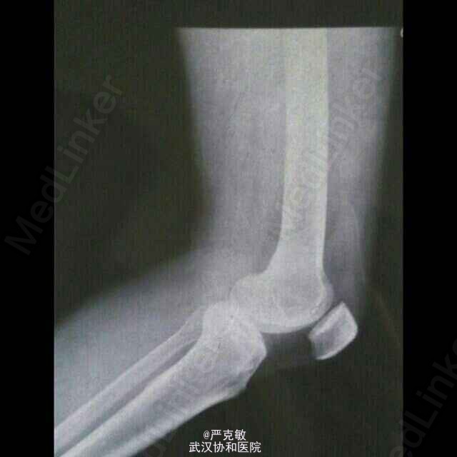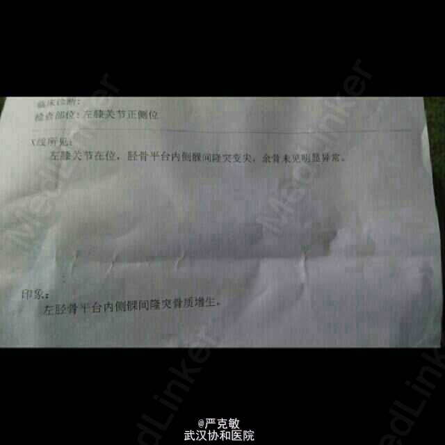 查体:左侧膝关节活动度减低,余未见明显异常。 辅查:左膝关节X片:左胫骨平台内侧髁间隆突骨质增生。
