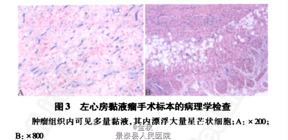 诊断——左心房粘液瘤并多发性脑梗死。 处理——人院后予阿司匹林抗血小板,低分子肝素钙抗凝以及活血等治疗。确诊后,患者在人院第4天转心胸外科行心脏肿瘤切除术,术中见肿瘤位于左心房,大小约30mmX 40mmX 40mm,有一窄蒂连于房间隔,完整摘除左心房肿瘤。术后病理学检查:心脏黏液瘤(图3),肿瘤大小25mmX20mmX12mm。术后第6天复查超声心动图:二尖瓣轻度返流,少量心包积液(图2B)。