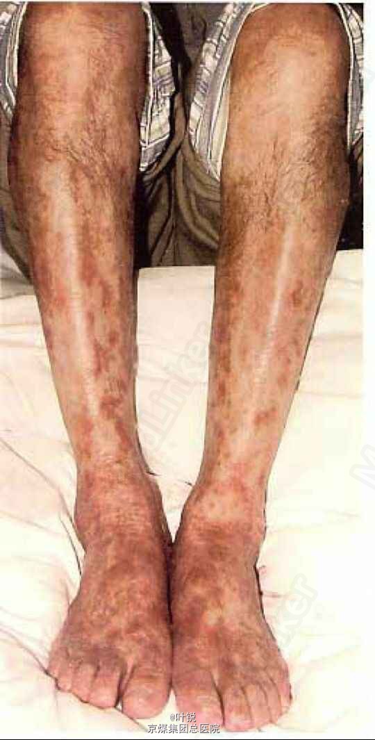 63岁男性,因双下肢、躯干皮损伴瘙痒14个月入院,曾就诊于外院诊断为色素性紫癜性苔藓样皮炎,予维生素C,芦丁皮损无好转,近4个月患者腹股沟、腹部、躯干也相继出现红斑表面有脱屑,瘙痒明显,皮疹由紫红转为暗红.