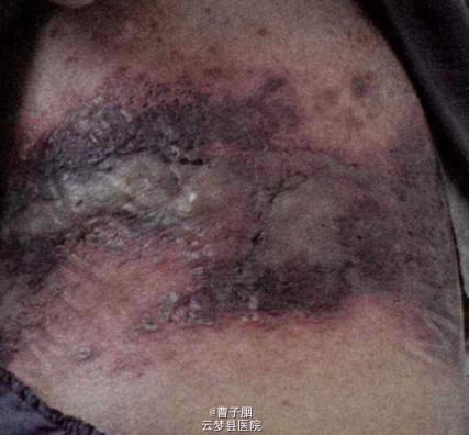 泛发性带状疱疹是重型带状疱疹,表现为在带状疱疹的基础上全身泛发水疱。严重者出现皮肤坏死及血疱,威胁患者生命。本例患者移植后长期服用免疫抑制药,是带状疱疹泛发全身的主要原因。