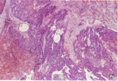 眼观:手臂肿块切除标本1个,大小4 cm×4cm×3 cm,其内见暗红色肿物,切面肿物界清,中央见大片暗红色出血、坏死区,周边少许灰红色区,质软。镜检:肿瘤组织内见大片出血、坏死,间质稀少;瘤细胞呈多边形,境界清楚,细胞质淡染或透亮,核圆形位于中央,核仁明显,此类细 胞成片排列,其间夹杂一团团的合体型细胞,胞质丰富、深染、嗜酸,细胞核多个、增大深染或皱缩(图2)。提示异型肿瘤细胞,巢团状浸润性生长,间质大片出血坏死,初步诊断为生殖源性恶性肿瘤,复查血HCG大于200 000 mlU/ml,尿HCG强(+),免疫组化结果显示:CK(+),HCG(+),HPL (+),AFP(一)。经病理提示绒癌可能后,再次体检发现患者一侧睾丸肿大,有男性乳腺发育特征。