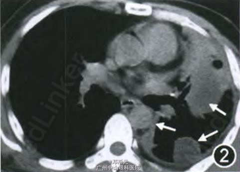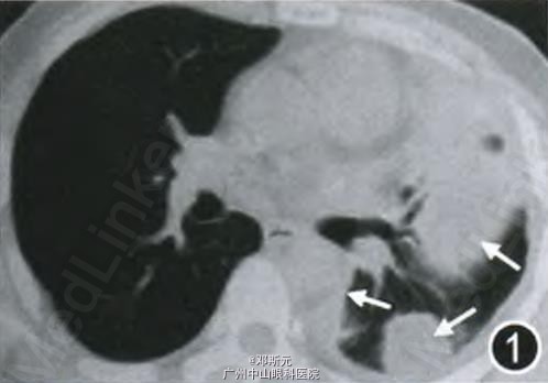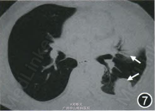 体检:右侧胸壁可见腔镜手术瘢痕,左侧胸廓塌陷,可见长约4 cm手术瘢痕,左肺下界上移,左肺呼吸音弱,双肺未闻及干湿性哕音,余未见异常。