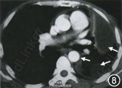 因患者左侧胸膜广泛增厚并左侧胸腔包裹性积液,左侧胸廓塌陷,手术完整切除困难,患者于2013年8月开始吉西他滨联合顺铂方案化疗(吉西他滨1.8 g,第1及第8天,顺铂 130 mg,第1天),2个疗程后复查胸部CT无明显变化,病情评估为稳定(图7,8)。4个疗程后,评估病情仍为稳定,但患者左侧胸痛进行性加重,给予止痛及对症处理,因化疗期间呕吐明显,患者拒绝进一步化疗。本例确诊时已有左侧胸膜广泛受累,已无手术机会,故选择吉西他滨联合顺铂方案化疗,4个疗程后病情稳定。患者拒绝进一步化疗,发病11个月(2014年2月)后失访。