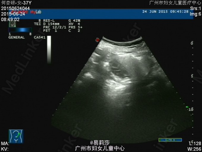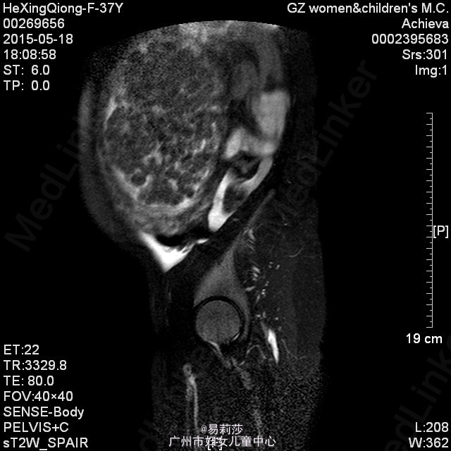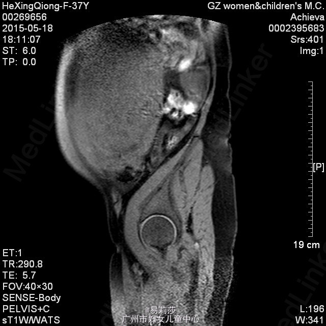 患者何××,女,G0P0,36岁,因“体检发现子宫肌瘤半年”于2015-06-23入院。患者平素月经规则,LMP:2015-06-12。患者于半年前体检时发现子宫肌瘤,未治疗。2月前,患者自觉腹部包块逐渐增大,2015-05-12彩超检查示:子宫前位,后壁见一实性低回声团,范围约125×193×192mm,边界尚清,明显外突,内回声欠均匀,宫腔线隐约可见,双侧附件因肿块遮挡,显示不清,CDFI:上述低回声团内见短棒及条索状血流信号,查血常规示:血红蛋白31g/L,拟“子宫平滑肌瘤”收入我科。入院后查贫血组合示缺铁,予输红细胞悬液6个单位,复查血色素81g/L,患者要求出院,此次再次入院要求手术治疗。查体:T36.2℃,P100次/分,R20次/分,BP132/74mmHg,神清,中度贫血外观,心肺听诊无异常,腹膨隆,宫底达剑突下1cm,无压痛、反跳痛。妇科检查:外阴发育正常,阴毛女性分布;阴道畅,分泌物色白,无异味;宫颈光滑,无肥大,无举痛及着色;宫体前位,增大,宫底达剑突下1cm,质硬,活动差,无压痛;双侧附件未扪及包块及压痛。 辅助检查:2015-06-24彩超检查示:胆囊息肉(胆固醇结晶),副脾,肝、胰、右肾未见明显异常回声,左肾下极异常回声团——畸胎瘤?,考虑来源左侧卵巢可能,与左肾关系密切,巨大子宫肌瘤,左侧卵巢显示不清,请进一步检查。MRI检查示:1.子宫左侧壁巨大实性肿块影,考虑巨大子宫肌瘤可能性大,子宫明显受压;2、左肾下方类圆形病变,考虑畸胎瘤可能性大;3、双侧腹膜后区主动脉、下腔动脉周围见不规则囊状影,考虑淋巴管扩张可能;4、盆腔少量积液。