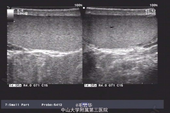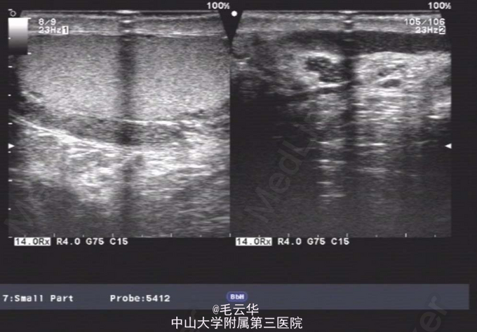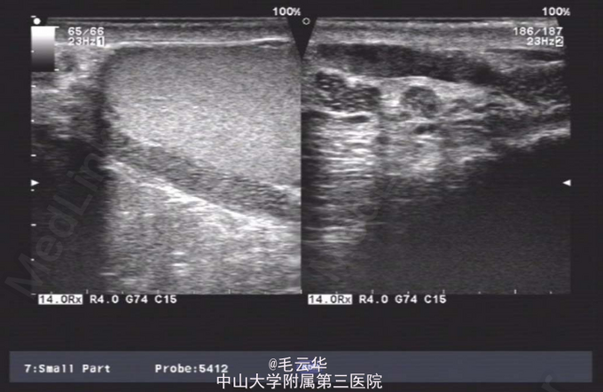 入院诊断:无精症查因。 入院完善术前相关检查,射精管切开+输精管探查术。麻醉成功后,取截石位,常规消毒铺巾,连接好4.5/6.5F输尿管硬镜和监视系统。经尿道进镜入膀胱,见双侧输尿管开口裂隙状,膀胱内未见异常。尿道未见明显异常,精阜稍隆起。镜下未找到双侧射精管开口,硬膜外导管引导进镜入前列腺小囊,见囊腔狭小,囊壁炎性增厚,囊内未见射精管开口,考虑射精管口梗阻,遂换用电切镜,切除部分精阜,切开双侧射精管口,再用硬膜外导管引导输尿管硬镜入射精管,进入困难,结合病史及影像学检查,提示射精管发育不良并梗阻。作双侧阴囊切口,逐层切开,游离出睾丸和精索,探查双侧输精管,见左侧输精管呈纤维条索状,未见管腔结构,右侧未见输精管,考虑为先天缺如,遂行双侧睾丸活检,术野予以止血,逐层缝合切口,术毕。手术过程顺利,麻醉效果满意,术中无出血,术后安返病房。