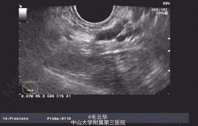 双肾区无红肿、隆起,无叩痛,双侧肋脊点、肋腰点无压痛。腹平软,双侧上中输尿管点无压痛,膀胱区无压痛。双侧腹股沟区未触及肿物,尿道外口未见异常,阴囊无水肿,双睾丸可触及,肛周皮肤无红肿。盆腔MR提示:双侧精囊腺体积缩小(未见片)。彩超提示:右侧输精管、精囊缺如可能;双侧睾丸偏大,附睾小管扩张;前列腺囊肿。精液常规提示精液量少,离心后无精子。