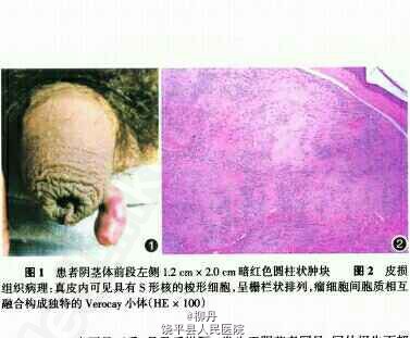 患者男,34岁。因发现阴茎结节10余年入院。皮疹缓慢进行性增大,现已增至小枣样大,阴茎勃起功能一直未受影响,但近2年来性生活后皮损局部时常出现破溃及渗液,自行外用消炎药膏后可痊愈。