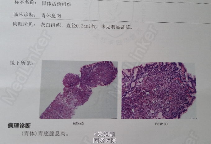 查体:T:36.6℃,P:78次/分,R:20次/分,BP:120/80mmHg。神志清楚,查体合作,系统查体无特殊。生理反射存在,病理反射未引出。 专科情况:皮肤巩膜无黄染,全身皮肤黏膜未见出血点、紫癜和瘀斑,浅表淋巴结未触及肿大,胸骨无压痛,心肺听诊无明显异常,腹平软,无压痛反跳痛,肝脾肋下未触及,双下肢无凹陷性水肿。 辅助检查:2015-5-16当地医院胃镜示:胃体息肉。 2015-5-20公安县人民医院体检报告示:心电图示:窦性心律,正常心电图,66次/分。