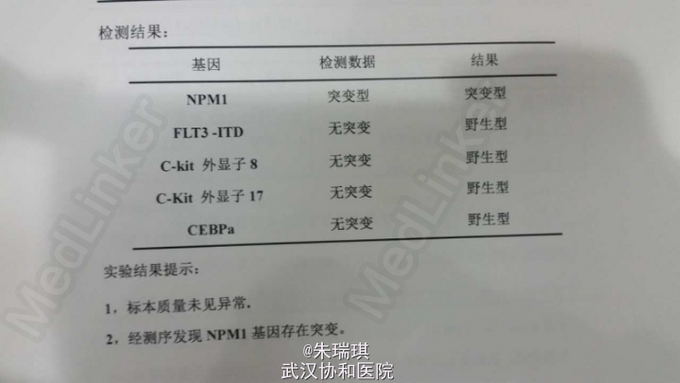查体:生命体征正常,心肺腹未见明显异常。 专科情况:皮肤巩膜无黄染,全身皮肤黏膜未见出血点、紫癜及瘀斑,浅表淋巴结未触及肿大,胸骨无压痛。肝脾肋下未触及,双下肢无凹陷性水肿。 辅助检查:胸部CT平扫示纵隔内淋巴结增多,未见明显淋巴结增大,双侧腋窝多发小淋巴结。 骨穿结果提示AML-m2a,NPM1基因突变