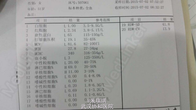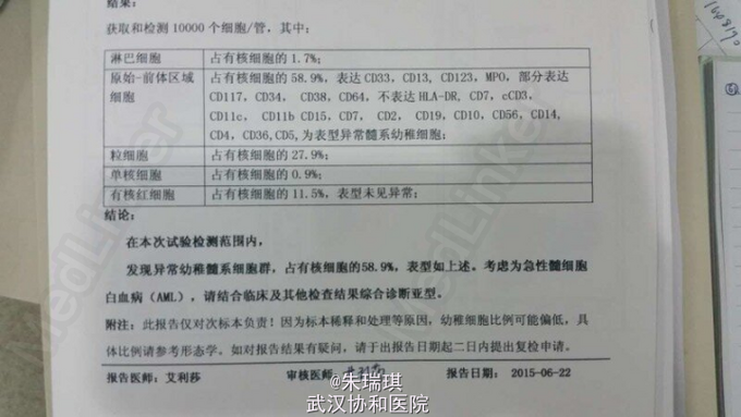 主诉:发热、咽痛半月 现病史:半月前无明显诱因出现发热咽痛,体温最高37.9℃,不伴咳嗽咳痰胸痛等症状。到当地医院查血常规提示白细胞高,血小板少,门诊以”AL?“收治。起病以来一般情况良好。