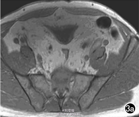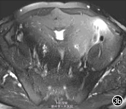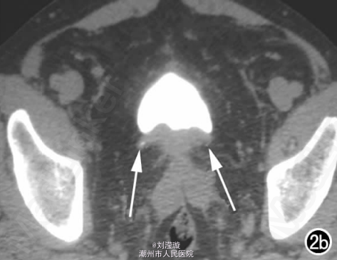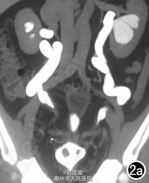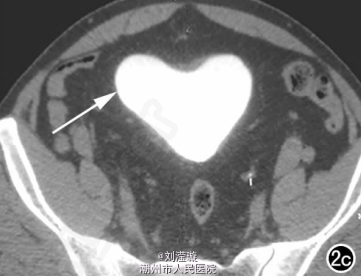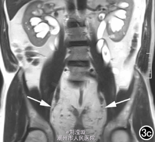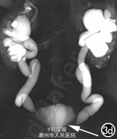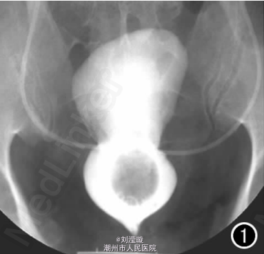 腹部B超示双肾增大,双肾慢性肾病声像;双肾中度积液伴双输尿管上段扩张。 IVPshi双侧输尿管中或下段梗阻。 膀胱造影:经尿道置管后,注射对比剂充盈膀胱,膀胱下半部先充盈,继续灌注对比剂后见膀胱完全显影,膀胱形态异常,呈“倒葫芦状”(图1)。 CT增强扫描行延迟期 MPR重组,见双侧肾盂、肾盏扩张积液;双侧输尿管纡曲、扩张,下端呈鸟嘴样变窄;膀胱变形、体积减小(图2); MRI平扫示双侧肾盂、肾盏扩张积液,双侧输尿管扩张并下端鸟嘴样变窄,盆腔内多量脂肪沉积,分布于膀胱、直肠周围,T1WI、T2WI呈明显高信号,T2WI抑脂像呈稍高信号,膀胱受压变形、体积减小(图3a~c); MRU示双侧肾盂肾盏扩张、积液,双侧输尿管显著纡曲、扩张,下端鸟嘴样变窄,管壁光整,膀胱变形、体积较小、位置抬高(图3d)。