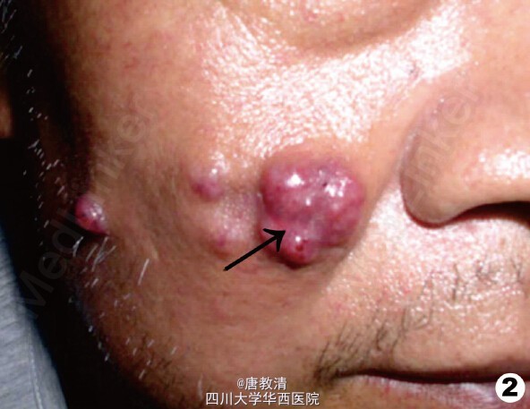 本病诊断主要通过组织活检确认是否继发于内脏肿瘤转移,在组织病理学上,皮肤转移癌一般与原发癌相似,但比原发肿瘤的分化更差,异形性明显。 恶性肿瘤患者发生皮肤转移时,通常已是癌症终末阶段,说明肿瘤已广泛转移。因此笔者认为应采取 综合措施治疗,局部放疗可缩小肿瘤、缓解压迫症状,其效果较好,尤其对仅限于皮肤局部区域的多发病灶及预计生存期较长者可作为治疗首选。