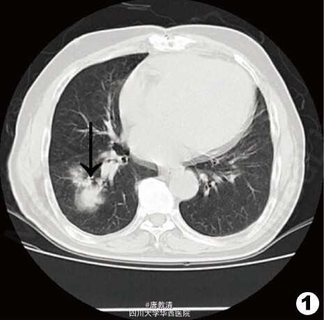 患者,男,71岁。因咳嗽、咳血、伴气促2个月,右颊部肿块1个月入院。 2个月前,患者无明显诱因出现咳嗽、咳痰、痰中带血伴气促,自行口服抗炎、止咳药物(具体药名及剂量不详)后,自觉症状有所缓解。