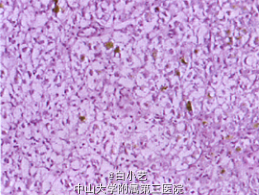 肝错构瘤(mesenchymal hamartoma of liver,MHL)由Maresch于1903年首次报道1956年Edmondson发现其独特的病理学特点命名为MHL,MHL系婴儿期少见肝脏良性肿瘤,平均发病年龄为15个月,罕见于成人,病因尚不明确。近年来有学者提出其发生与染色体19q13.4位点变异相关。罕有MHL继发恶变的报道f11。本病多发于肝右叶,早期可无症状或仅有腹胀等不典型消化道症状,随肿块的增大可伴随出现I临近脏器压迫症状,肿瘤压迫胆管、门静脉亦可出现梗阻性黄疸、上消化道出血等症状。成人MHL需与肝血管瘤、肝癌、肝囊肿、局灶性结节性增生等鉴别。治疗以手术切除为佳,原则为彻底切除肿瘤,尽量保留原有健康肝组织,手术治疗疗效良好,偶有局部复发之报道。本例患者以不典型消化道症状就医,术前行AFP、CT、超声造影等检查提示肝占位性病变,术前已考虑MHL可能,近一步诊断措施为穿刺活检.但因患者惧怕穿刺而未能于术前明确诊断.进而行手术切除。术中见肿瘤形态、生长方式及大体标本符合MHL特征,术后病理证实为MHL。术中肿瘤切除彻底,术后随访至今未见复发。