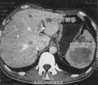 患者。男,34岁。因“左上腹部胀痛不适4个月”人院。患者4个月前出现反复左上腹坠胀不适,伴 轻度疼痛,近两个月出现右侧腰背部胀痛.伴右肩背部柬带感。外院B超、CT检查提示“脾脏占位,肝脏多发结节。