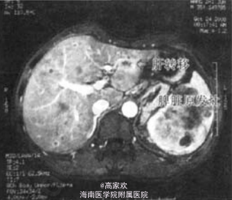 入院查体:全身浅表淋巴结未及肿大,皮肤巩膜无黄染。腹平软,无压痛,脾脏肋下2 em,质韧,轻度压痛。肝脏肋下未及。AFP、CA199、CEA、肝功能正常。 B超提示:肝脏大小、形态正常,肝内可见多发低回声占位,界清。内部回声欠均,部分呈“牛眼征”,最大位于右后叶,约11mmx8mm。脾脏大小形态饱满,被膜完整,脾实质内可见一范围约100 mmx62 mm的偏强回声占位.界清.内部回声欠均匀.CDFI示血流信号丰富。 上腹部MRI平扫+增强显示:脾脏体积增大.内部巨大肿块影。最大径约10 cm,内部信号混杂TIWI呈等低混杂信号,q'2WI呈高低混杂信号.增强扫描后呈不均匀显著强化。肝脏实质内可见多发结节影,个案报告·增强扫描后可见环形强化.最大直径约1cm。肝门、腹膜后未见明确肿大淋巴结