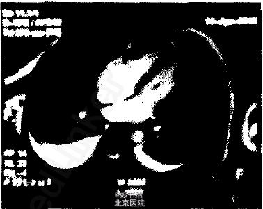 查体:生命体征平稳,精神尚可,呼吸急促,不能平卧,面色略黄,无水肿,咽部充血,扁桃体Ⅱ度肿大,颈部无抵抗,双肺呼吸音低,右肺底叩诊浊音,心音尚有力,律齐,可闻及2/6级舒张期杂音,腹平软,腹水征阳性,肝右肋缘下5 cm,剑突下6 cm.质地略韧,边缘锐利,压痛,脾左肋下4 cm,压痛,余未见异常。 辅助检查:外院胸部CT示(图1)心包积液(中度),胸腔积液(中度)。心脏彩色多普勒超声(彩超)示中量心包积液.左心室射血分数62%。MP抗体弱阳性。本院胸片示肺部炎症;双侧胸腔少量积液。血常规示白细胞计数轻度升高。以中性粒细胞为主。超敏C反应蛋白(hs—CRP)、心肌酶、肝肾功能、电解质、红细胞沉降率(血沉)、风湿检测、人类疱疹病毒、乙型肝炎相关标志物检测、人类免疫缺陷病毒、梅毒、血糖、抗核抗体、柯萨奇病毒及结核抗体均正常。结核菌素试验(PPD)阴性。人院治疗第3天行心包积液检查:MP培养阳性、乳酸脱氢酶1 664 U/L,李凡他试验阳性,未检出瘤细胞,未找到结核杆菌。