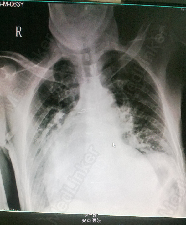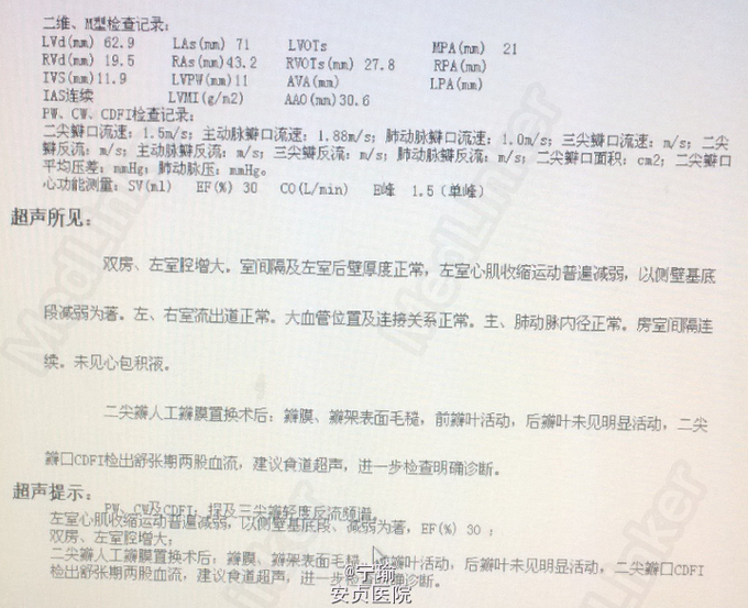 查体——体温36℃,脉搏110次/分,呼吸18次/分,血压137/95mmHg。神志清楚,精神状态较差,半卧位,急性痛苦病容,表情痛苦。前正中线可见一自胸骨上窝至剑突纵行手术疤痕,另可见一平行于第5肋上缘水平疤痕与纵行疤痕相连。双肺呼吸运动对称,肋间隙未见异常,双侧语颤对称。双肺呼吸音粗,可闻及呼气末少量哮鸣音、少量湿罗音。心前区无隆起,心界向两侧扩大,心率125次/分,心律绝对不齐,第一心音强弱不等,未闻及早搏。二尖瓣区闻及机械瓣关闭音。双下肢无水肿。余查体无异常。 辅查——血常规:白细胞计数18.05G/L,中心粒细胞计数14.64G/L。BNP 10804ng/l,血沉27mm/h,PCT 0.28ug/l,肾功能正常。胸片(图1):两肺肺水肿征,心影扩大。心脏彩超(图2):左室心肌收缩普遍减弱,EF30%,双房及左室腔增大,二尖瓣人工瓣膜表面毛糙,前瓣活动,后瓣未见明显活动,二尖瓣口CDFI检出舒张期两股血流,建议食道超声进一步检查明确。颈动脉彩超:双侧颈动脉内膜粗糙增厚,右侧壶腹部附壁斑块形成。抽血送血培养。