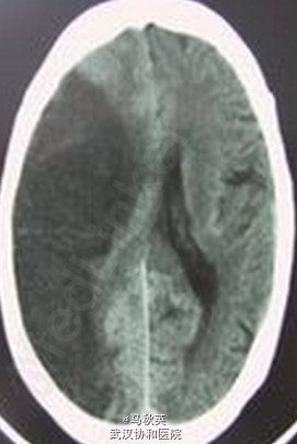BP289/180mmHg,余生命征平稳,神志浅昏迷,查体合作,急性病容,心肺腹未见明显异常,双侧瞳孔等大等圆,对光反射减弱,左侧鼻唇沟变浅,颈强1指,四肢肌张力均增高,肌力检查不配合,右侧肢体偶见自发活动,左侧肢体疼痛刺激有反应,左侧巴氏征(+),右侧巴氏征可疑(+)。 B型脑尿钠肽106.4pg/ml,CK-MB12.6ng/ml,TNI289pg/ml,肌酸激酶1128U/L,乳酸脱氢酶330U/L,血钠150.3mmol/L 当地医院头颅CT示大面积脑梗。 入院后查颅脑CT:右侧额顶岛颞及部分枕叶见大片低密度影,其间散在高密度影,考虑大片脑梗塞并少许梗塞后出血。右侧脑肿胀,右侧脑室受压移位,中线左移越1.7cm,考虑大脑镰下疝 肺部CT:两下肺纹理稍粗乱,为少许炎症;两侧少量胸水,肝脂肪变,肝右叶钙化或结石,左叶小囊肿可能 出院前CT:右侧大脑半球大片状低密度灶,考虑为脑梗塞,较前密度减低、肿胀减轻,中线结构左移较前明显好转