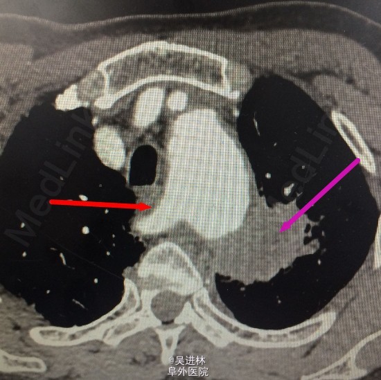 讨论:我在图片中用两种颜色标记了两种东东,左边的是肺癌,但是,右边从主动脉弓上面分出一只血管(正常主动脉弓在这个水平没有分支),你知道这是什么血管吗?这种情况其实不少见哦,欢迎讨论!胸外科尤其做食管癌的时候,如果遇到这根血管,需谨慎,心中有数。