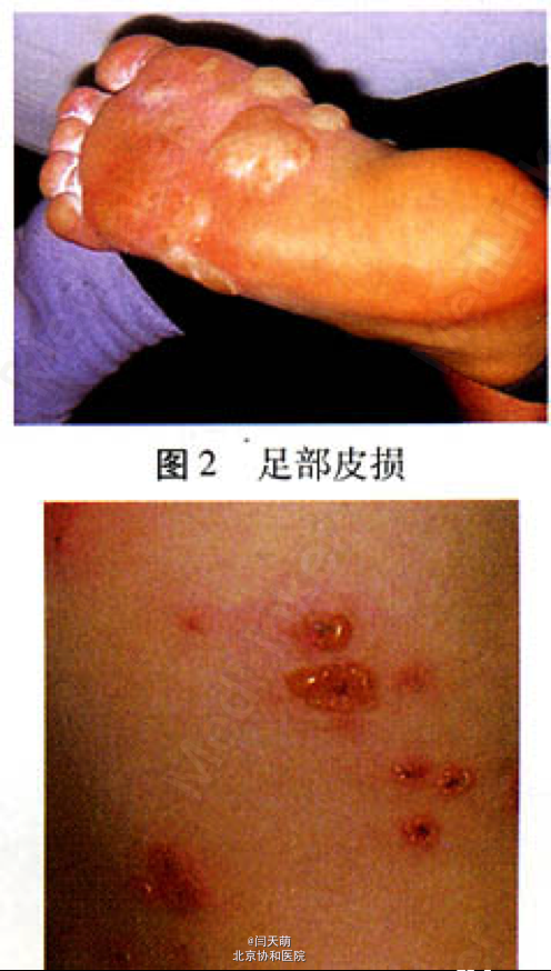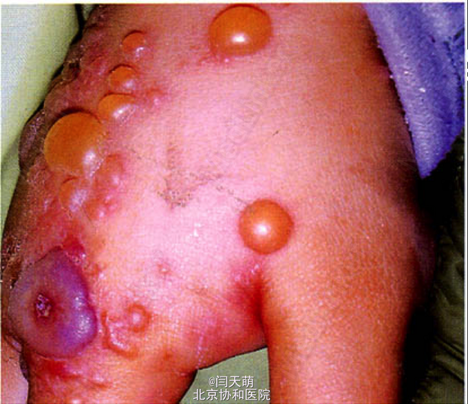 女,5岁,因全身出现水疱脓疱伴疼痛8天入院, 8天前无明显诱因从唇周及颈部出现大小不等水疱,呈圆形或椭圆形,水疱不易破裂,疱液清,伴疼痛。第二天,水疱逐渐扩大,疱液开始浑浊,部分水疱中央出现脐凹样改变,5天前皮损泛发全身。起病以来,口腔黏膜一过性破溃,自行痊愈,无发热。患儿既往体健,无食物药物过敏史,父母非近亲结婚,患儿堂姐有类似疾病史。