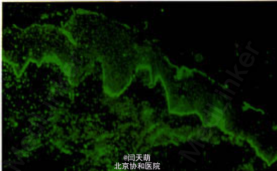 系统检查无异常 皮肤科情况:口周、颈部见大小不一的水疱、脓疱、脓痂。掌跖、躯干、肛周、外生殖器周围有圆形、类圆形厚壁水疱,黄豆至蚕豆大小,疱壁紧张,疱液清,部分中央可见脐凹,尼氏征阴性,口腔及外阴粘膜无损害。 实验室检查:WBC:20.4*10~9,EOS:0.48*10~9,尿便常规、肝肾功能正常。IgG 6.89g/L(7.23~16.8),IgA 1.15g/L(0.69-3.82),IgM 0.97(0.63-2.77),IgE 0.18(0-0.36),C3 1.15 (0.85-1.93),C4 0.23(0.16-0.47),病毒全套提示 单纯疱疹病毒I,II型IgM 阳性。 皮肤组织病理(右大腿皮损)示:表皮下水疱,真皮浅层较 多嗜酸性粒细胞浸润。皮肤免疫病理:取水疱旁正常皮 肤做直接免疫荧光检查,结果示表皮基底膜带有IgG及C3线 状荧光带沉积。