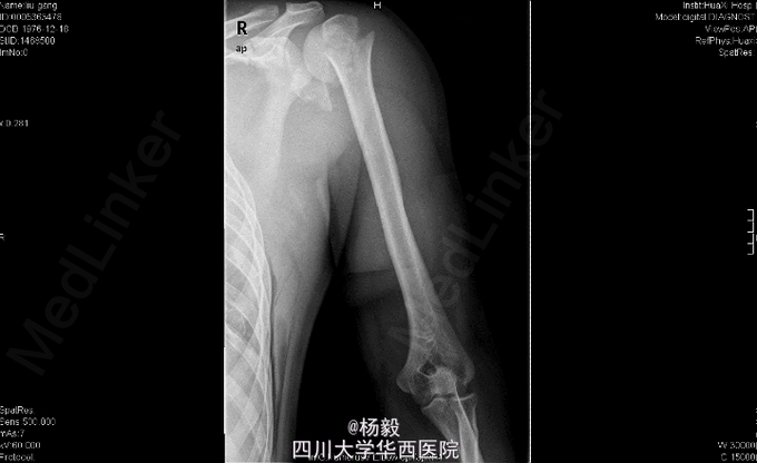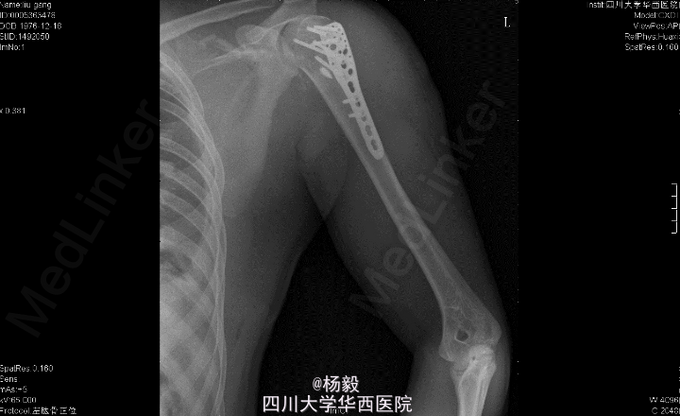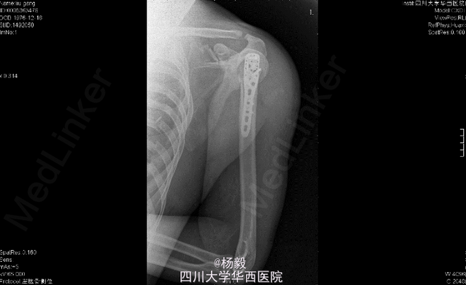 初步诊断:1、左肩胛骨粉碎性骨折。2、左肱骨外科颈骨折伴神经损伤。3、左侧胸腔积液闭式引流术后。4、左侧多发肋骨骨折。5、左肺挫伤。6、脾脾脏损伤? 全麻下行左肱骨外科颈骨折切开复位内固定术。