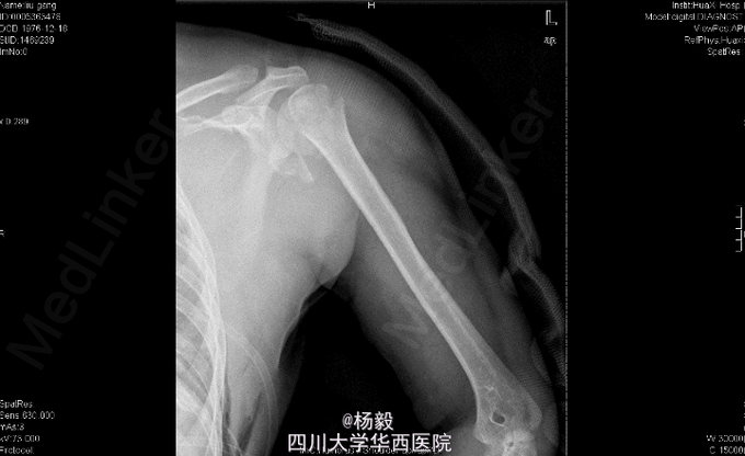 男,33岁11月,因“车祸伤后全身多处疼痛、左上肢活动障碍9小时”入院。 患者自述入院前9小时,被货车撞伤,具体受伤姿势及着力方式不清,患者原发昏迷约5分钟,醒后能回忆受伤情况,患者述胸部及左肩部疼痛,呼吸困难,气促,左上肢感觉麻木,左手伸屈活动受限,患者无恶心呕吐,无咯血,感腹部稍微疼痛,无大小便失禁,其余四肢无活动障碍,曾经当地医院诊治,具体诊断不详,行对症治疗后,患者感呼吸困难加重,为进一步治疗,患者转我院,门诊请胸科会诊后行左侧胸腔闭式引流术,请普外科会诊后,认为腹部无明显指征,暂观察,急诊以“左肩胛骨骨折,左肱骨外科颈骨折,胸腔积液'收住我科。