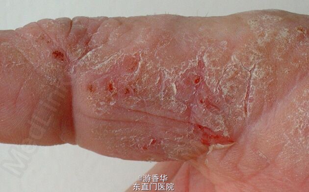 查体:双手大鱼际处皮肤出现片状干燥皲裂、脱屑,皮肤增厚伴有鳞屑,触摸时皮硬,无渗液,无红肿。