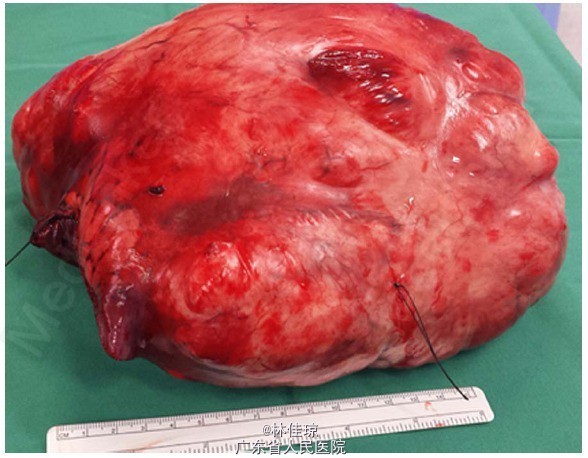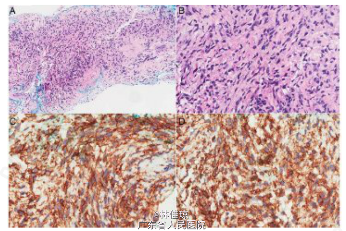 查体:生命体征正常,甲状腺肿大,中等大小,质地柔软,胸壁和右臂静脉扩张,无杵状指或发绀。第三肋下肺叩诊呈浊音,右胸下半部分呼吸音减弱;气管无偏斜。心腹查体均未见明显异常。 辅查: 末梢血血糖值为 1.9mmol/L。 血常规、生化、甲功均正常; 胸部 X 线片:显示胸部右下区占位性病变,密度均匀,界限清晰,右侧膈肌明显升高并可能膨出。 CT 扫描:胸部右下方有一巨大肿块,病变不均匀强化,大小 11.6×16.3×15.6cm;临近肋骨无破坏,但是临近肺、上下腔静脉受影响,证明为巨大胸膜纤维瘤。 组织病理学检查:对肿块进行 CT 引导下肺穿刺活检和组织学检查,可见梭形肿瘤细胞;有丝分裂像少见;梭形细胞 CD34 和 bcl-2 阳性,AE1/3 和 S-100 阴性。这些特征与孤立性纤维性肿瘤(SFT)一致。