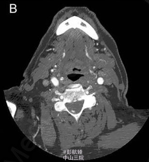 头颅血管造影(CTA)结果(如图 1 所示)示颈椎管可见斑点征和高密度影。 进一步完善 MRI 证实为 C4-T1 的硬膜外血肿(如图 2 所示)