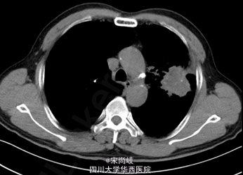 胸廓桶状,双肺呼吸音过清。胸部CT提示双肺慢支炎肺气肿表现,左肺上叶见4.9*4.0CM软组织肿块。