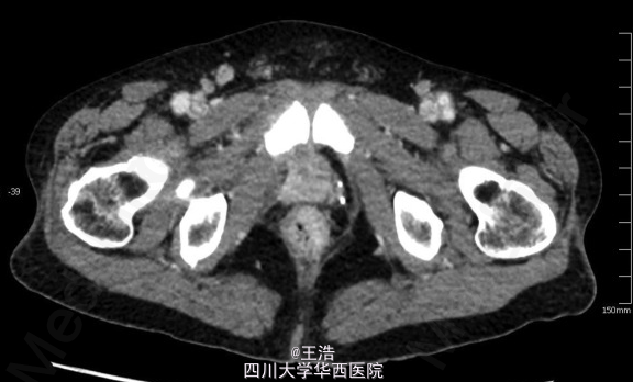 患者术后随访20个月。胸膝卧位检查,可触及距肛门约2.5cm一菜花样新生物。盆腔MRI可见直肠壁增厚,在前列腺与输尿管底部之间可见一肿块。盆腔CT未见淋巴结受累,腹部胸部CT也正常。初步诊断为直肠癌。