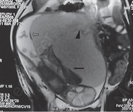 MRI诊断为巨大的绒毛膜下血肿 由于患者血流动力学稳定,所以继续严密观察 孕32周行剖宫产 术中可见胎盘的巨大绒毛膜下血肿25*20cm