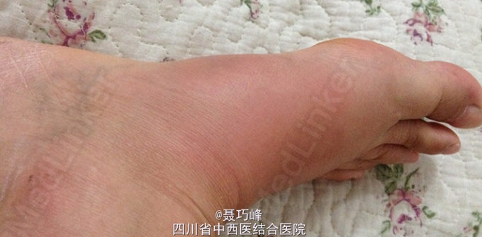 右侧足弓及足背见片状水肿性红斑,无水疱等,局部皮温较高,皮色红,触压痛不明显。