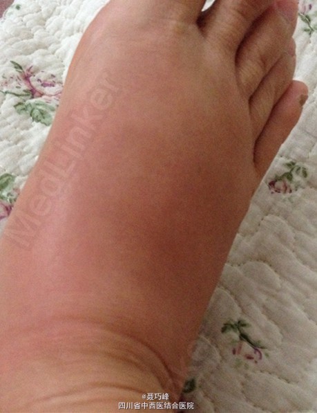 右足背水肿性红斑伴瘙痒1天。自述1天前又足被蚊子叮咬后局部瘙痒不适,未予重视。第二天晨起发现右足背红肿明显,局部皮温较高,瘙痒较甚,无发热,恶寒,头晕,麻木等不适,于我科就诊,诊断为:虫咬皮炎。