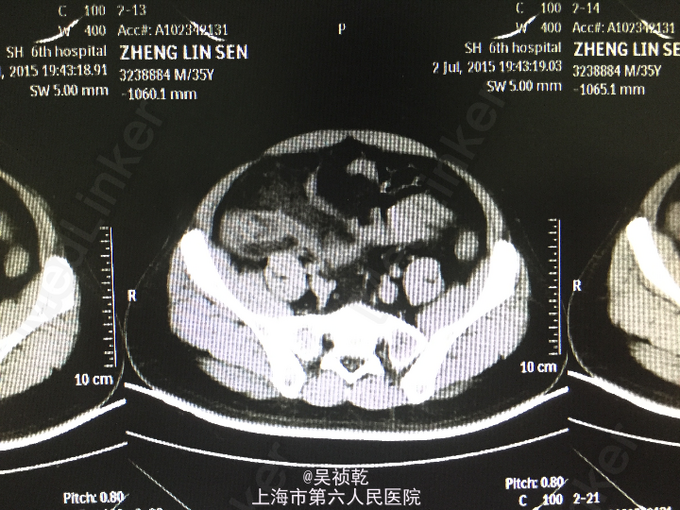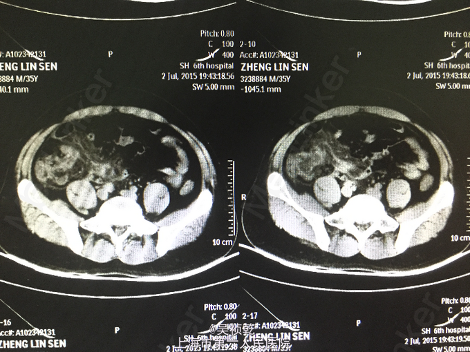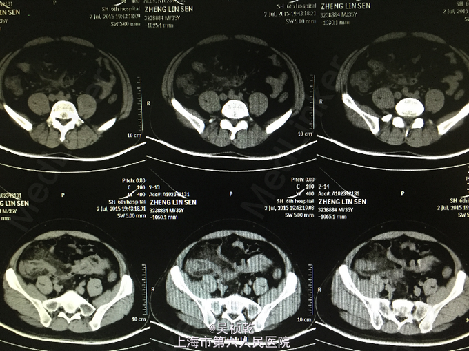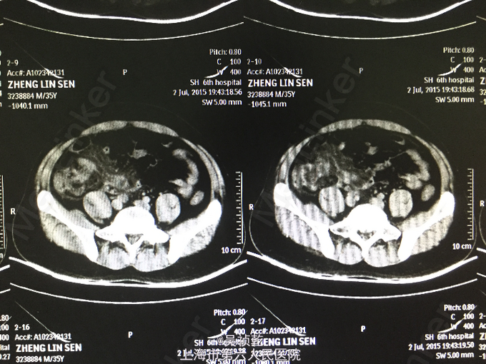 患者男性,35岁。因“右下腹疼痛1天,伴恶心、呕吐”入院。患者1个月前无明显诱因下脐周疼痛,后转移至右下腹,疼痛固定。无恶心呕吐,无头晕乏力。于外院拟尿路感染治疗,补液消炎1周后症状缓解。昨日下午,右下腹疼痛加剧,伴发热,体温约38.2摄氏度,有恶心,呕吐症状。故来我院治疗,完善各项检查,查腹部CT;阑尾形态增粗伴阑尾壁肿胀,回盲部及阑尾周围可见大量渗出,前列腺密度均匀,未见明显增大,两侧精囊未见明显异常,膀胱充盈可,盆腔未见明显肿大淋巴结,盆腔未见明显积液,。为进一步治疗收住入院。患者自起病以来,精神可,胃纳差,大便如常,小便如常,体重未见明显下降,睡眠一般。