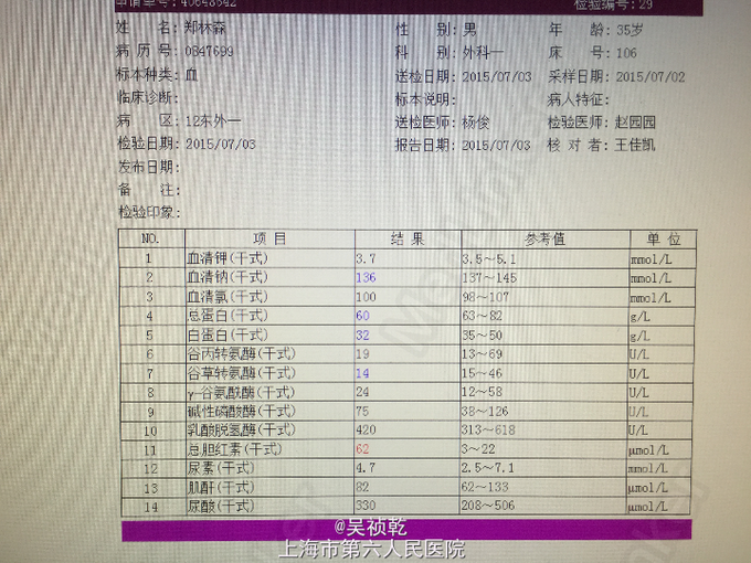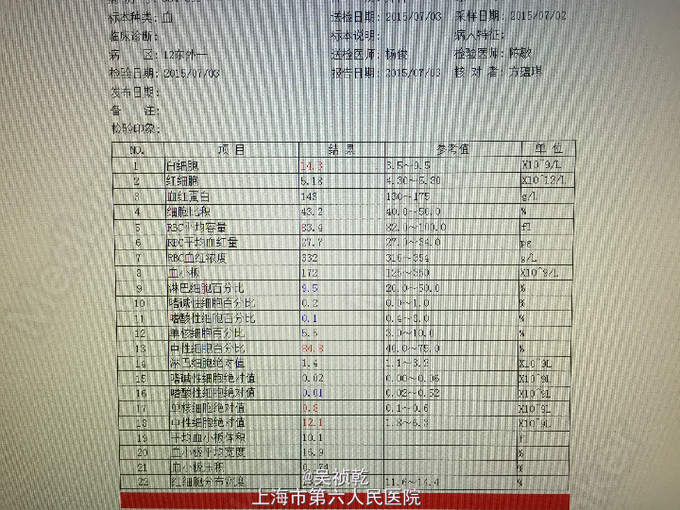 查体:腹部平坦,无胃肠型。腹壁柔软,有压痛,位于右下腹,伴反跳痛,无腹部包块,振水音阴性,未触及肝;未触及脾 ,无移动性浊音,肝区无叩痛。肠鸣音正常。结肠充气试验:阴性;腰大肌试验:阴性;闭孔内肌试验:阴性。 辅查:2015-7-3 生化检验报告:血清钠(干式) 136 mmol/L ↓,总蛋白(干式) 60 g/L ↓,白蛋白(干式) 32 g/L ↓,谷草转氨酶(干式) 14 U/L ↓,总胆红素(干式) 62 μmol/L ↑。 血常规检验报告:白细胞 14.3 X10^9/L ↑,红细胞 5.18 X10^12/L ,淋巴细胞百分比 9.5 % ↓,嗜酸性细胞百分比 0.1 % ↓,中性细胞百分比 84.8 % ↑,嗜酸性细胞绝对值 0.01 X10^9L ↓,单核细胞绝对值 0.8 X10^9L ↑,中性细胞绝对值 12.1 X10^9L 腹部CT:阑尾形态增粗伴阑尾壁肿胀,回盲部及阑尾周围可见大量渗出,前列腺密度均匀,未见明显增大,两侧精囊未见明显异常,膀胱充盈可,盆腔未见明显肿大淋巴结,盆腔未见明显积液,。