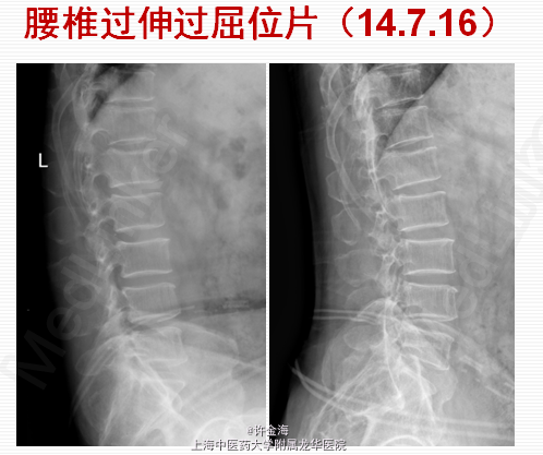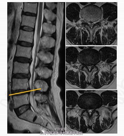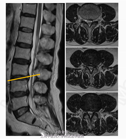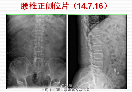 检查:推入病房,腰部活动受限;腰椎生理弧度变直,L3-4椎旁压痛、叩痛;直腿抬高试验右侧<30 °,加强试验(+),左侧>70;双下肢肌张力正常,右侧股四头肌肌力V-;右大腿外侧浅感觉减退;右侧膝腱反射(+),踝反射(++);髌、踝阵挛(-),Babinski征(-)。 评分:腰VAS7分;VAS腿8分;JOA10分