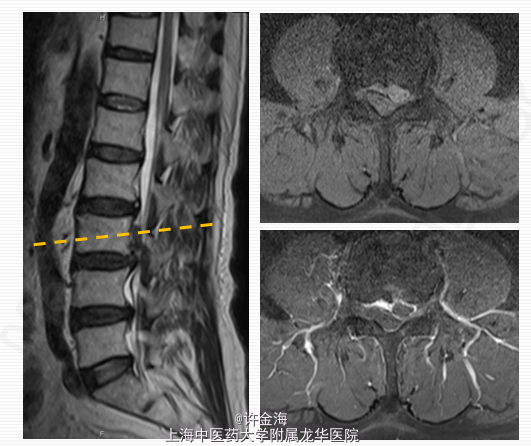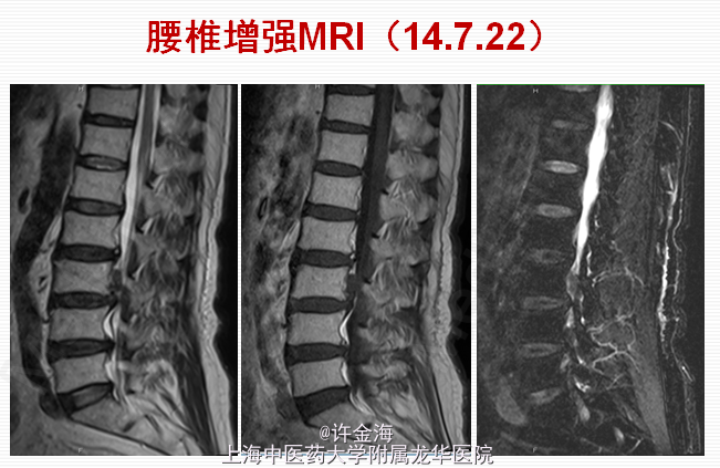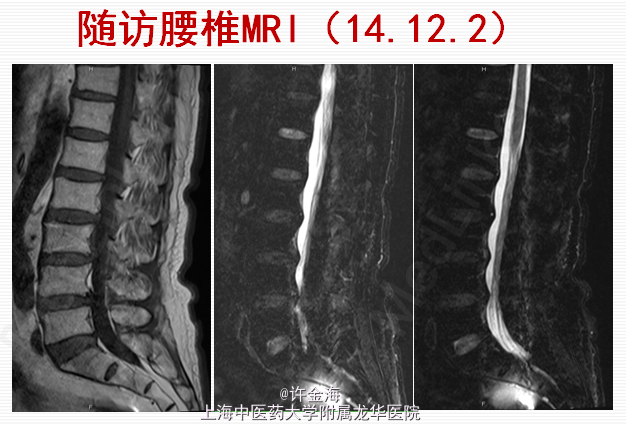 2周后评分:腰VAS2分;腿VAS2分;JOA22分 出院后续治疗:服用中药3月;电针、艾灸每周1次 5月后随访: 复查MRI:游离椎间盘消失 评分:腰VAS0分;腿VAS1分;JOA26分 体检:腰部活动正常,双下肢直腿抬高试验>70°,肌力V级,浅感觉正常,膝踝反射(++),病理征(-)。