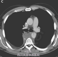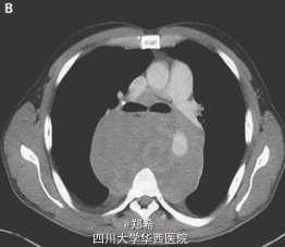 患者为30岁男性,2个月以来胸闷,气短,伴呼吸困难,吞咽困难,吞咽疼痛及体重下降14KG。3年前因I期精原细胞癌行睾丸切除术,术后失访。