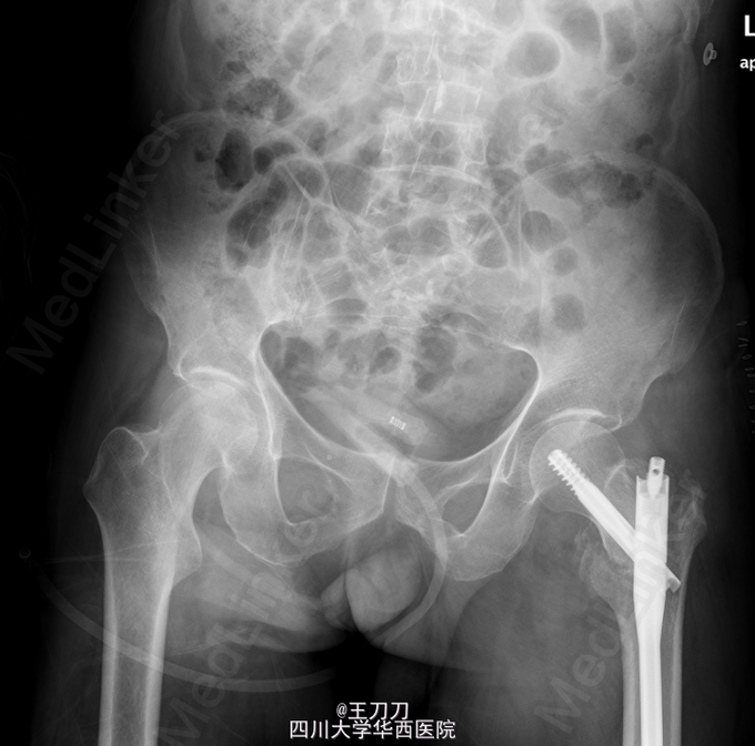 左髋部肿胀,压痛阳性,左髋部活动受限,左下肢屈曲缩短畸形,左足趾活动可,末梢血运良好。肢体肌力查体不配合。病理征阴性。外院检查:骨盆CT示“左侧股骨粗隆间粉碎性骨折”.