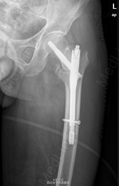 初步诊断:左侧股骨颈骨折. 在全麻下行“左股骨粗隆间骨折闭合复位内固定术”. 取以左股骨大转子顶点向近端延伸切口长约5cm,逐层切开皮肤,皮下组织,纵行分离臀大肌,臀中肌纤维,触及大转子顶点,以大转子顶点前中1/3为进针点,开口,C臂机引导下置入导针至骨折断端以远。扩髓至远侧骨折端,C臂机引导下沿导针进髓内钉至合适深度,连接锁钉支架,套筒定位后切开皮肤约2cm,C臂机引导下以合适前倾角进导针经股骨颈至股骨头前端,C臂机透视见主钉位置良好,打入防旋钉后拧入主钉,拔除导针。以适宜锁定钉行远端孔锁定,取下支架。冲洗,止血,逐层缝合至皮肤,无菌敷料覆盖。