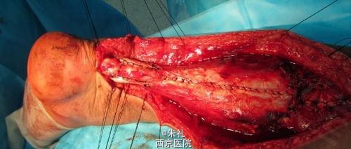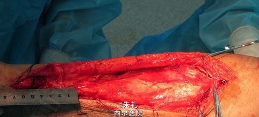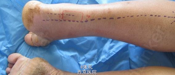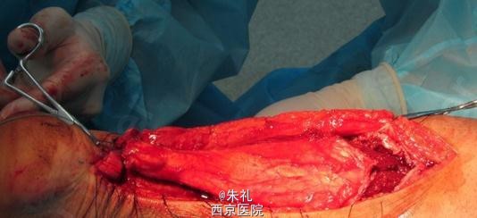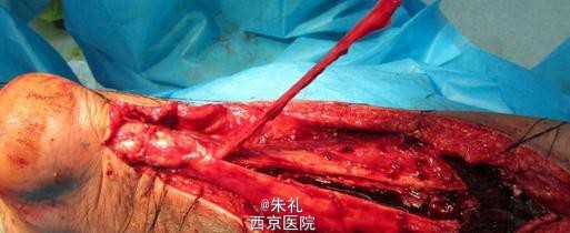 患者中年男性,因行走时拉伤致左下肢肿痛、活动障碍1月余,曾到当地性“消炎针输液”、当地行长期中草药外敷等治疗但效果不理想,到我院就诊,确诊为陈旧性跟腱断裂。