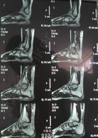 入院查体:左踝关节明显水肿,跟腱区可扪及一明显凹陷及空虚感,跟腱连续性中断,跖屈乏力 提踵试验(+),Thompson征(+),Matles试验(+)